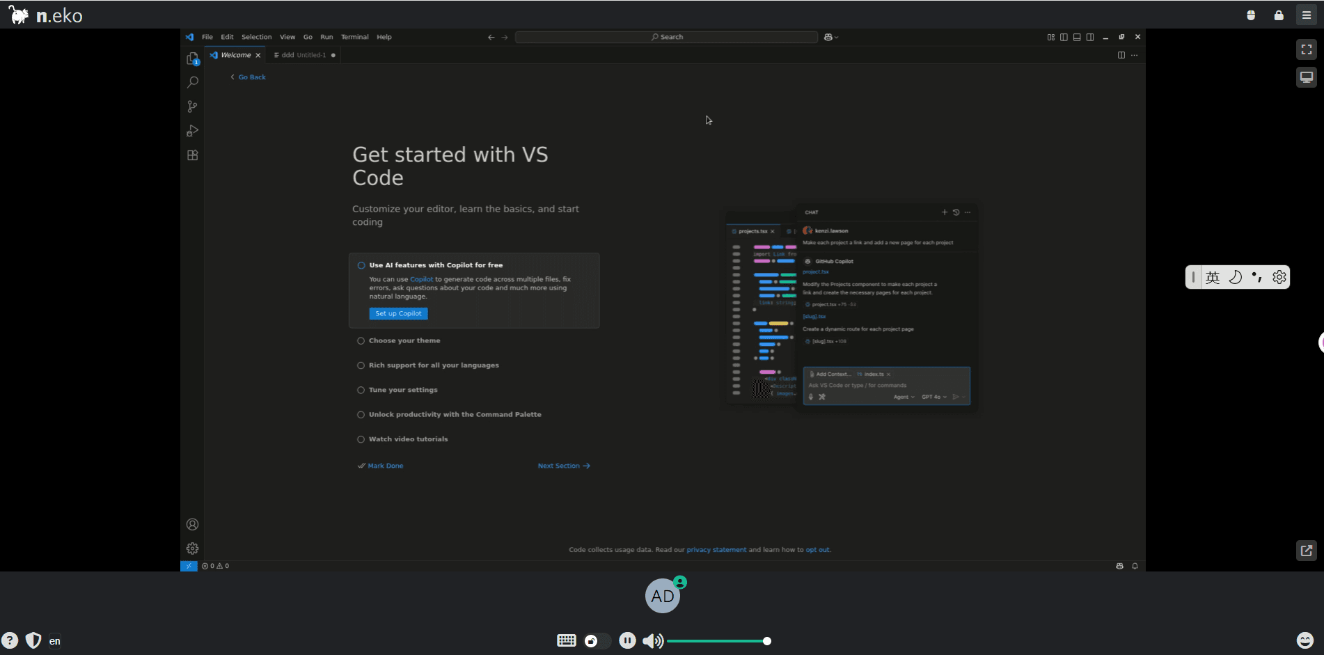 n.eko自称是一个利用 WebRTC 技术的在 Docker 中运行的浏览器,但实际上,它可以运行任何在 Linux 上可以运行的程序,包括 VSCode 。